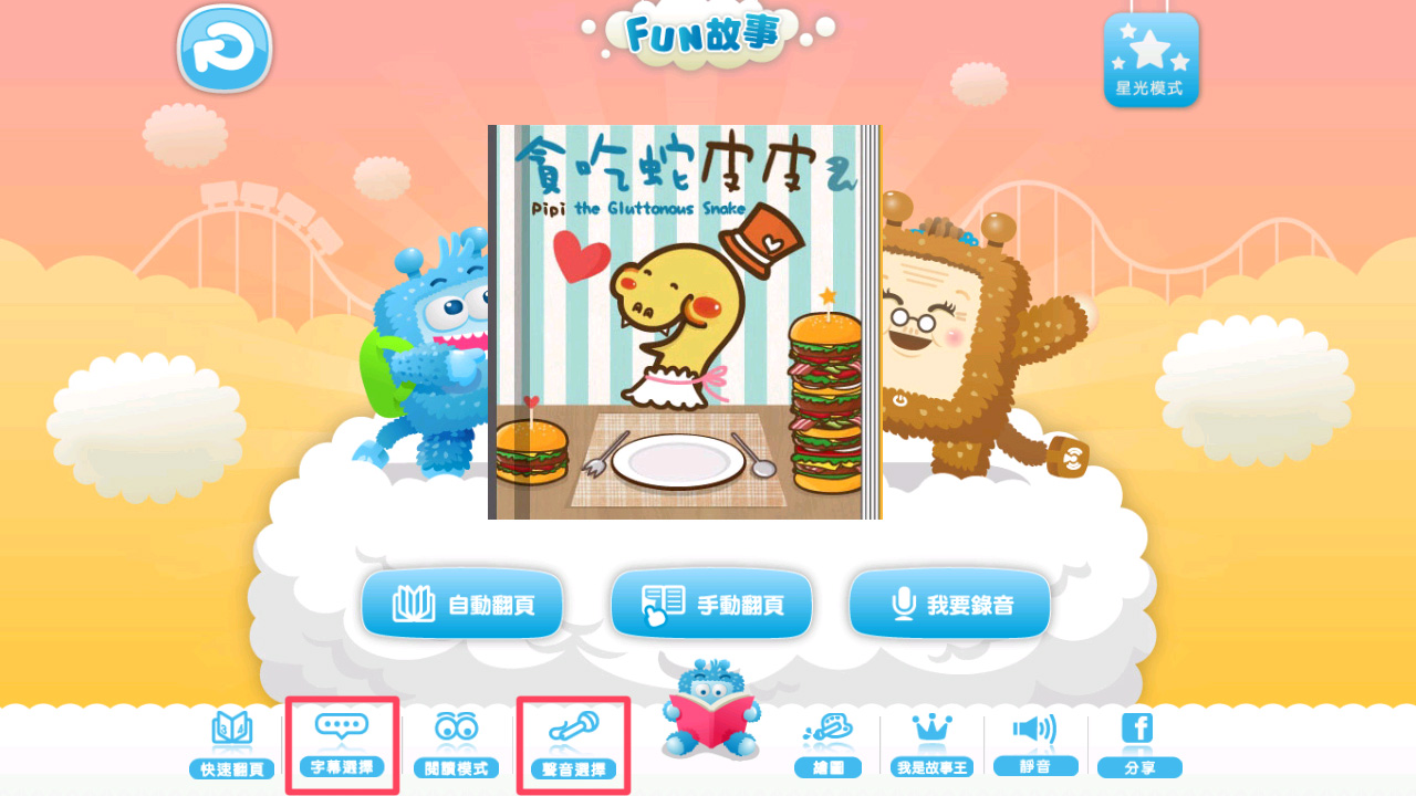 Fun故事裡的故事書,字幕和語音可以隨時切換中、英文語系,看故事還可以學習第二外語喔!