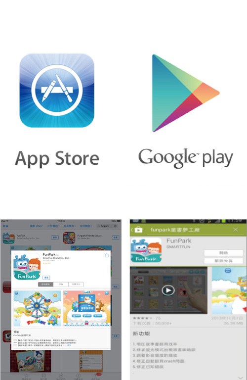請至APP store或Google Play商店搜尋並下載安裝FunPark童書夢工廠